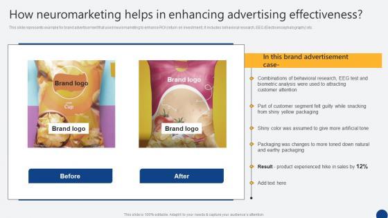 This slide represents example for brand advertisement that used neuromarketing to enhance ROI return on investment. It includes behavioral research, EEG Electroencephalography etc. If your project calls for a presentation, then Slidegeeks is your go-to partner because we have professionally designed, easy-to-edit templates that are perfect for any presentation. After downloading, you can easily edit How Neuromarketing Helps In Enhancing Advertising Driven Digital Marketing Download Pdf and make the changes accordingly. You can rearrange slides or fill them with different images. Check out all the handy templates This slide represents example for brand advertisement that used neuromarketing to enhance ROI return on investment. It includes behavioral research, EEG Electroencephalography etc.