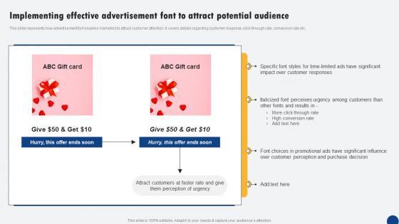 This slide represents how advertisement font enables marketers to attract customer attention. It covers details regarding customer response, click-through rate, conversion rate etc. This modern and well-arranged Implementing Effective Advertisement Font To Attract Driven Digital Marketing Inspiration Pdf provides lots of creative possibilities. It is very simple to customize and edit with the Powerpoint Software. Just drag and drop your pictures into the shapes. All facets of this template can be edited with Powerpoint, no extra software is necessary. Add your own material, put your images in the places assigned for them, adjust the colors, and then you can show your slides to the world, with an animated slide included. This slide represents how advertisement font enables marketers to attract customer attention. It covers details regarding customer response, click-through rate, conversion rate etc.
