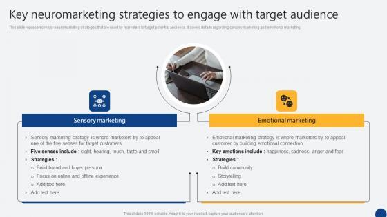 This slide represents major neuromarketing strategies that are used by marketers to target potential audience. It covers details regarding sensory marketing and emotional marketing. Welcome to our selection of the Key Neuromarketing Strategies To Engage With Target Driven Digital Marketing Information Pdf. These are designed to help you showcase your creativity and bring your sphere to life. Planning and Innovation are essential for any business that is just starting out. This collection contains the designs that you need for your everyday presentations. All of our PowerPoints are 100 percent editable, so you can customize them to suit your needs. This multi-purpose template can be used in various situations. Grab these presentation templates today This slide represents major neuromarketing strategies that are used by marketers to target potential audience. It covers details regarding sensory marketing and emotional marketing.