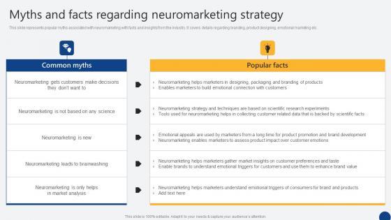 This slide represents popular myths associated with neuromarketing with facts and insights from the industry. It covers details regarding branding, product designing, emotional marketing etc. Are you searching for a Myths And Facts Regarding Neuromarketing Strategy Driven Digital Marketing Microsoft Pdf that is uncluttered, straightforward, and original Its easy to edit, and you can change the colors to suit your personal or business branding. For a presentation that expresses how much effort you have put in, this template is ideal With all of its features, including tables, diagrams, statistics, and lists, its perfect for a business plan presentation. Make your ideas more appealing with these professional slides. Download Myths And Facts Regarding Neuromarketing Strategy Driven Digital Marketing Microsoft Pdf from Slidegeeks today. This slide represents popular myths associated with neuromarketing with facts and insights from the industry. It covers details regarding branding, product designing, emotional marketing etc.