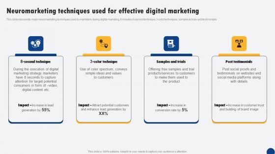 This slide represents major neuromarketing techniques used by marketers during digital marketing. It includes 8 second technique, 3 color techniques, samples and trials and testimonials. This Neuromarketing Techniques Used For Effective Digital Driven Digital Marketing Rules Pdf from Slidegeeks makes it easy to present information on your topic with precision. It provides customization options, so you can make changes to the colors, design, graphics, or any other component to create a unique layout. It is also available for immediate download, so you can begin using it right away. Slidegeeks has done good research to ensure that you have everything you need to make your presentation stand out. Make a name out there for a brilliant performance. This slide represents major neuromarketing techniques used by marketers during digital marketing. It includes 8 second technique, 3 color techniques, samples and trials and testimonials.