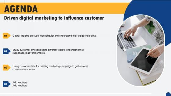 Find a pre-designed and impeccable Agenda Driven Digital Marketing To Influence Customer Demonstration Pdf. The templates can ace your presentation without additional effort. You can download these easy-to-edit presentation templates to make your presentation stand out from others. So, what are you waiting for Download the template from Slidegeeks today and give a unique touch to your presentation. Our Agenda Driven Digital Marketing To Influence Customer Demonstration Pdf are topically designed to provide an attractive backdrop to any subject. Use them to look like a presentation pro.