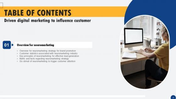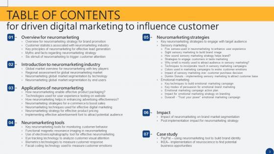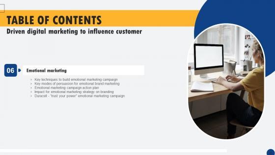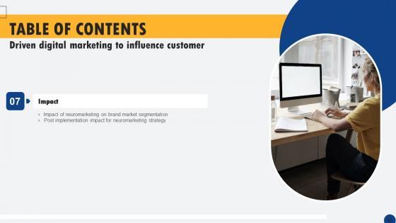 Want to ace your presentation in front of a live audience Our Driven Digital Marketing To Influence Customer Table Of Contents Brochure Pdf can help you do that by engaging all the users towards you. Slidegeeks experts have put their efforts and expertise into creating these impeccable powerpoint presentations so that you can communicate your ideas clearly. Moreover, all the templates are customizable, and easy-to-edit and downloadable. Use these for both personal and commercial use. Our Driven Digital Marketing To Influence Customer Table Of Contents Brochure Pdf are topically designed to provide an attractive backdrop to any subject. Use them to look like a presentation pro.