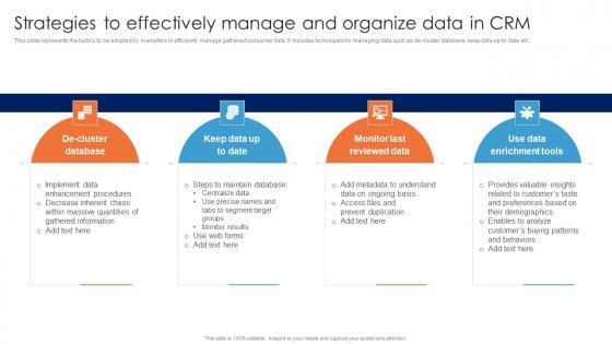 This slide represents the tactics to be adopted by marketers to efficiently manage gathered consumer data. It includes techniques for managing data such as de-cluster database, keep data up to date etc.Retrieve professionally designed Strategies To Effectively Manage And Organize Data In Guide For Data Driven Advertising Introduction Pdf to effectively convey your message and captivate your listeners. Save time by selecting pre-made slideshows that are appropriate for various topics, from business to educational purposes. These themes come in many different styles, from creative to corporate, and all of them are easily adjustable and can be edited quickly. Access them as PowerPoint templates or as Google Slides themes. You do not have to go on a hunt for the perfect presentation because Slidegeeks got you covered from everywhere. This slide represents the tactics to be adopted by marketers to efficiently manage gathered consumer data. It includes techniques for managing data such as de-cluster database, keep data up to date etc.