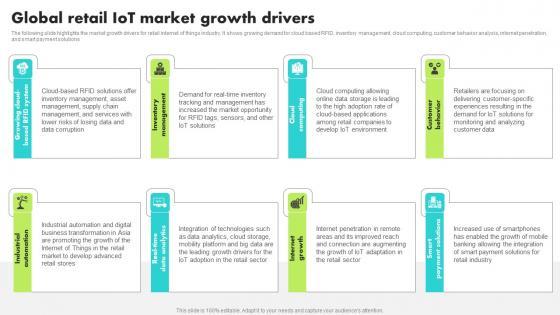 The following slide highlights the market growth drivers for retail internet of things industry. It shows growing demand for cloud based RFID, inventory management, cloud computing, customer behavior analysis, internet penetration, and smart payment solutions Get a simple yet stunning designed Global Retail IoT Market Growth Drivers Guide For Retail IoT Solutions Analysis Infographics Pdf. It is the best one to establish the tone in your meetings. It is an excellent way to make your presentations highly effective. So, download this PPT today from Slidegeeks and see the positive impacts. Our easy to edit Global Retail IoT Market Growth Drivers Guide For Retail IoT Solutions Analysis Infographics Pdf can be your go to option for all upcoming conferences and meetings. So, what are you waiting for Grab this template today. The following slide highlights the market growth drivers for retail internet of things industry. It shows growing demand for cloud based RFID, inventory management, cloud computing, customer behavior analysis, internet penetration, and smart payment solutions