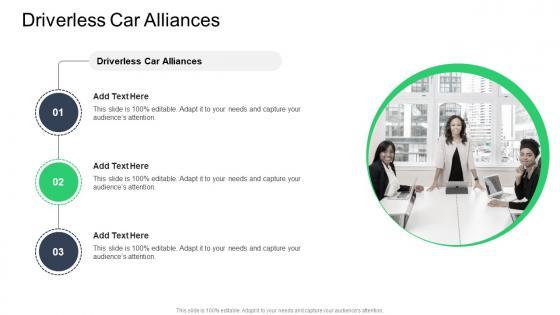 Presenting our innovatively-designed set of slides titled Driverless Car Alliances In Powerpoint And Google Slides Cpb. This completely editable PowerPoint graphic exhibits Driverless Car Alliances that will help you convey the message impactfully. It can be accessed with Google Slides and is available in both standard screen and widescreen aspect ratios. Apart from this, you can download this well-structured PowerPoint template design in different formats like PDF, JPG, and PNG. So, click the download button now to gain full access to this PPT design. Our Driverless Car Alliances In Powerpoint And Google Slides Cpb are topically designed to provide an attractive backdrop to any subject. Use them to look like a presentation pro.