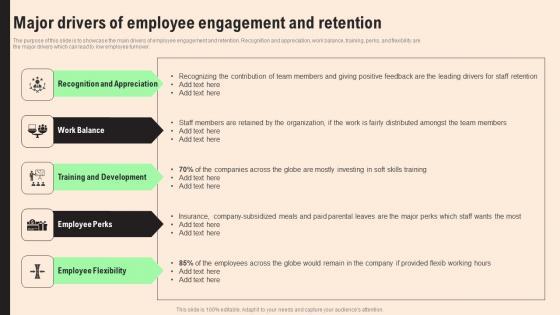 The purpose of this slide is to showcase the main drivers of employee engagement and retention. Recognition and appreciation, work balance, training, perks, and flexibility are the major drivers which can lead to low employee turnover. There are so many reasons you need a Major Drivers Of Employee HR Retention Techniques For Business Owners Pictures Pdf. The first reason is you can not spend time making everything from scratch, Thus, Slidegeeks has made presentation templates for you too. You can easily download these templates from our website easily. The purpose of this slide is to showcase the main drivers of employee engagement and retention. Recognition and appreciation, work balance, training, perks, and flexibility are the major drivers which can lead to low employee turnover.