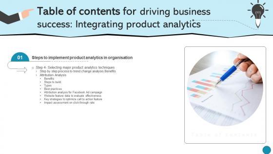 Formulating a presentation can take up a lot of effort and time, so the content and message should always be the primary focus. The visuals of the PowerPoint can enhance the presenters message, so our Driving Business Success Integrating Product Analytics Table Of Contents was created to help save time. Instead of worrying about the design, the presenter can concentrate on the message while our designers work on creating the ideal templates for whatever situation is needed. Slidegeeks has experts for everything from amazing designs to valuable content, we have put everything into Driving Business Success Integrating Product Analytics Table Of Contents. Our Driving Business Success Integrating Product Analytics Table Of Contents are topically designed to provide an attractive backdrop to any subject. Use them to look like a presentation pro.