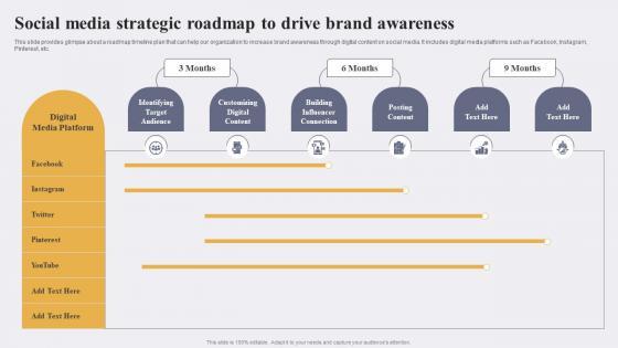 This slide provides glimpse about a roadmap timeline plan that can help our organization to increase brand awareness through digital content on social media. It includes digital media platforms such as Facebook, Instagram, Pinterest, etc. Explore a selection of the finest Social Media Strategic Roadmap To Drive Brand Enhancing Conversion Rate By Leveraging Pictures Pdf here. With a plethora of professionally designed and pre-made slide templates, you can quickly and easily find the right one for your upcoming presentation. You can use our Social Media Strategic Roadmap To Drive Brand Enhancing Conversion Rate By Leveraging Pictures Pdf to effectively convey your message to a wider audience. Slidegeeks has done a lot of research before preparing these presentation templates. The content can be personalized and the slides are highly editable. Grab templates today from Slidegeeks. This slide provides glimpse about a roadmap timeline plan that can help our organization to increase brand awareness through digital content on social media. It includes digital media platforms such as Facebook, Instagram, Pinterest, etc.