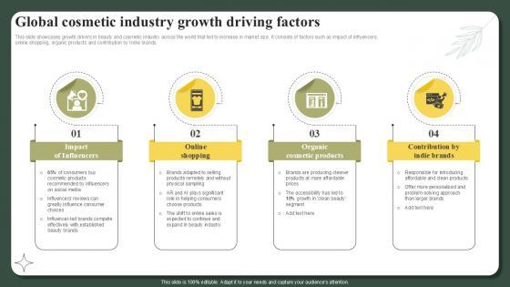 This slide showcases growth drivers in beauty and cosmetic industry across the world that led to increase in market size. It consists of factors such as impact of influencers, online shopping, organic products and contribution by Indie brands. Make sure to capture your audiences attention in your business displays with our gratis customizable Global Cosmetic Industry Growth Driving Factors Successful Launch Ppt Slide These are great for business strategies, office conferences, capital raising or task suggestions. If you desire to acquire more customers for your tech business and ensure they stay satisfied, create your own sales presentation with these plain slides. This slide showcases growth drivers in beauty and cosmetic industry across the world that led to increase in market size. It consists of factors such as impact of influencers, online shopping, organic products and contribution by Indie brands.