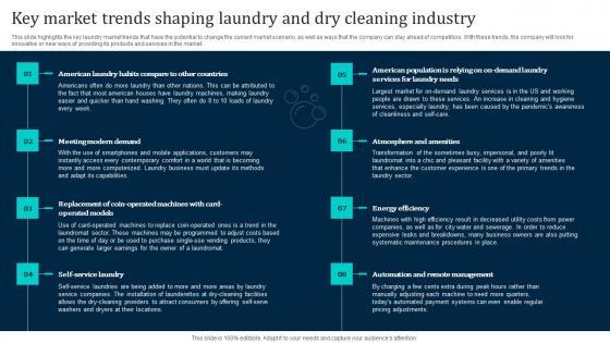 This slide highlights the key laundry market trends that have the potential to change the current market scenario, as well as ways that the company can stay ahead of competitors. With these trends, the company will look for innovative or new ways of providing its products and services in the market.This modern and well-arranged Key Market Trends Shaping Laundry And Dry Laundromat Business Plan Go To Market Infographics Pdf provides lots of creative possibilities. It is very simple to customize and edit with the Powerpoint Software. Just drag and drop your pictures into the shapes. All facets of this template can be edited with Powerpoint no extra software is necessary. Add your own material, put your images in the places assigned for them, adjust the colors, and then you can show your slides to the world, with an animated slide included. This slide highlights the key laundry market trends that have the potential to change the current market scenario, as well as ways that the company can stay ahead of competitors. With these trends, the company will look for innovative or new ways of providing its products and services in the market.
