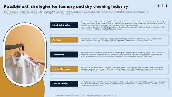 Slidegeeks has constructed Possible Exit Strategies For Laundry And Dry On Demand Laundry Business Plan Brochure Pdf after conducting extensive research and examination. These presentation templates are constantly being generated and modified based on user preferences and critiques from editors. Here, you will find the most attractive templates for a range of purposes while taking into account ratings and remarks from users regarding the content. This is an excellent jumping off point to explore our content and will give new users an insight into our top notch PowerPoint Templates. This slide represents exit strategies for laundry and dry cleaning industry such as sell offs, IPOs, mergers, and acquisitions that enable the entrepreneur to liquidate their position in a financial asset upon meeting specific criteria, limit the companys losses, and take a step back from day to day operations.