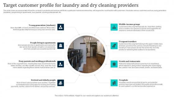 Boost your pitch with our creative Target Customer Profile For Laundry And Dry On Demand Laundry Business Plan Diagrams Pdf Deliver an awe inspiring pitch that will mesmerize everyone. Using these presentation templates you will surely catch everyones attention. You can browse the ppts collection on our website. We have researchers who are experts at creating the right content for the templates. So you do not have to invest time in any additional work. Just grab the template now and use them. This slide covers an assessment of how the companys products and services will fit into a particular market and where they will acquire the most traction with customers. It includes various customers such as young generation students people living in apartments, busy parents, working professionals, etc.
