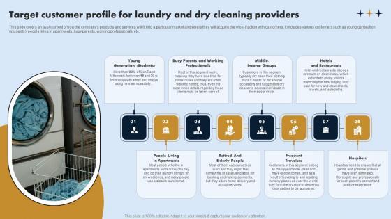 This slide covers an assessment of how the companys products and services will fit into a particular market and where they will acquire the most traction with customers. It includes various customers such as young generation students, people living in apartments, busy parents, working professionals, etc.Boost your pitch with our creative Target Customer Profile For Laundry And Dry Laundromat Business Plan Go To Market Diagrams Pdf Deliver an awe-inspiring pitch that will mesmerize everyone. Using these presentation templates you will surely catch everyones attention. You can browse the ppts collection on our website. We have researchers who are experts at creating the right content for the templates. So you do not have to invest time in any additional work. Just grab the template now and use them. This slide covers an assessment of how the companys products and services will fit into a particular market and where they will acquire the most traction with customers. It includes various customers such as young generation students, people living in apartments, busy parents, working professionals, etc.
