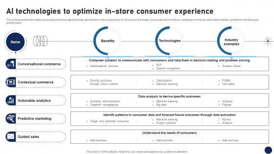 This slide presents information about various technologies that help optimize the in-store experience of consumers. It includes conversational commerce, contextual commerce, actionable analytics, predictive marketing and guided sales.There are so many reasons you need a Ai Technologies To Optimize In Store Consumer Experience DT SS V. The first reason is you can not spend time making everything from scratch, Thus, Slidegeeks has made presentation templates for you too. You can easily download these templates from our website easily. This slide presents information about various technologies that help optimize the in-store experience of consumers. It includes conversational commerce, contextual commerce, actionable analytics, predictive marketing and guided sales.