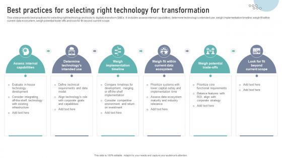 This slide presents best practices for selecting right technology and tools to digitally transform SMEs. It includes assess internal capabilities, determine technologys intended use, weigh implementation timeline, weigh fit within current data ecosystem, weigh potential trade-offs and look for fit beyond current scope.Do you have to make sure that everyone on your team knows about any specific topic I yes, then you should give Best Practices For Selecting Right Technology For Transformation DT SS V a try. Our experts have put a lot of knowledge and effort into creating this impeccable Best Practices For Selecting Right Technology For Transformation DT SS V. You can use this template for your upcoming presentations, as the slides are perfect to represent even the tiniest detail. You can download these templates from the Slidegeeks website and these are easy to edit. So grab these today This slide presents best practices for selecting right technology and tools to digitally transform SMEs. It includes assess internal capabilities, determine technologys intended use, weigh implementation timeline, weigh fit within current data ecosystem, weigh potential trade-offs and look for fit beyond current scope.