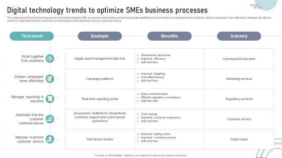 This slide presents how technology trends are transforming the SME processes and enabling enhanced operational efficiencies. It includes work together from anywhere, deliver campaigns more effectively. Manage reporting in real-time. Automate first-line customer communications and improves in-person customer service.Welcome to our selection of the Digital Technology Trends To Optimize SMEs Business Processes DT SS V. These are designed to help you showcase your creativity and bring your sphere to life. Planning and Innovation are essential for any business that is just starting out. This collection contains the designs that you need for your everyday presentations. All of our PowerPoints are 100 percent editable, so you can customize them to suit your needs. This multi-purpose template can be used in various situations. Grab these presentation templates today. This slide presents how technology trends are transforming the SME processes and enabling enhanced operational efficiencies. It includes work together from anywhere, deliver campaigns more effectively. Manage reporting in real-time. Automate first-line customer communications and improves in-person customer service.