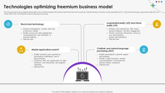 This slide presents various digital transformation tools and technologies that enable to optimize the freemium business model functioning. It includes mobile applications and IOT, blockchain technology, augmented reality AR and Virtual reality VR, and chatbots and natural language processing.From laying roadmaps to briefing everything in detail, our templates are perfect for you. You can set the stage with your presentation slides. All you have to do is download these easy-to-edit and customizable templates. Technologies Optimizing Freemium Business Model DT SS V will help you deliver an outstanding performance that everyone would remember and praise you for. Do download this presentation today. This slide presents various digital transformation tools and technologies that enable to optimize the freemium business model functioning. It includes mobile applications and IOT, blockchain technology, augmented reality AR and Virtual reality VR, and chatbots and natural language processing.