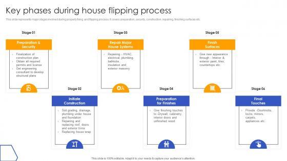 This slide represents major stages involved during property fixing and flipping process. It covers preparation, security, construction, repairing, finishing surfaces etc. This modern and well arranged Fix And Flip Method For Renovating Real Estate Key Phases During House Flipping Process Professional PDF provides lots of creative possibilities. It is very simple to customize and edit with the Powerpoint Software. Just drag and drop your pictures into the shapes. All facets of this template can be edited with Powerpoint no extra software is necessary. Add your own material, put your images in the places assigned for them, adjust the colors, and then you can show your slides to the world, with an animated slide included.