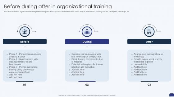 This slide showcases organizational training before during and after. It provides information about needs analysis, benchmarks, learning content, action plans, workshops, etc. Crafting an eye-catching presentation has never been more straightforward. Let your presentation shine with this tasteful yet straightforward Before During After In Organizational Training PPT Example SS template. It offers a minimalistic and classy look that is great for making a statement. The colors have been employed intelligently to add a bit of playfulness while still remaining professional. Construct the ideal Before During After In Organizational Training PPT Example SS that effortlessly grabs the attention of your audience Begin now and be certain to wow your customers This slide showcases organizational training before during and after. It provides information about needs analysis, benchmarks, learning content, action plans, workshops, etc.