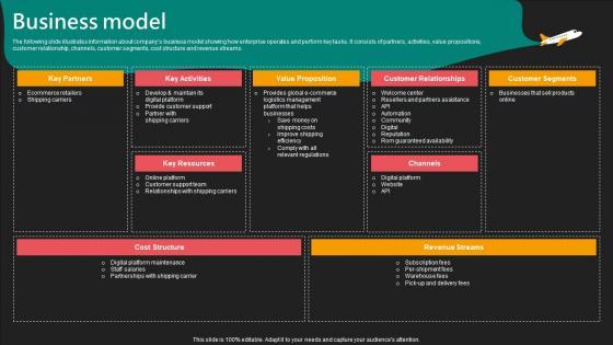 The following slide illustrates information about companys business model showing how enterprise operates and perform key tasks. It consists of partners, activities, value propositions, customer relationship, channels, customer segments, cost structure and revenue streams. Boost your pitch with our creative Business Model E Commerce Logistics Management Funding Pitch Deck Portrait Pdf. Deliver an awe-inspiring pitch that will mesmerize everyone. Using these presentation templates you will surely catch everyones attention. You can browse the ppts collection on our website. We have researchers who are experts at creating the right content for the templates. So you do not have to invest time in any additional work. Just grab the template now and use them. The following slide illustrates information about companys business model showing how enterprise operates and perform key tasks. It consists of partners, activities, value propositions, customer relationship, channels, customer segments, cost structure and revenue streams.