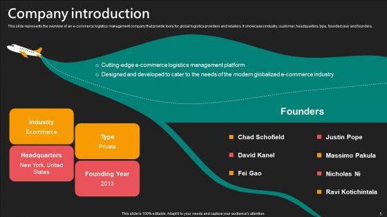 This slide represents the overview of an e-commerce logistics management company that provide tools for global logistics providers and retailers. It showcases industry, customer, headquarters, type, founded year and founders. Slidegeeks is one of the best resources for PowerPoint templates. You can download easily and regulate Company Introduction E Commerce Logistics Management Funding Pitch Deck Elements Pdf for your personal presentations from our wonderful collection. A few clicks is all it takes to discover and get the most relevant and appropriate templates. Use our Templates to add a unique zing and appeal to your presentation and meetings. All the slides are easy to edit and you can use them even for advertisement purposes. This slide represents the overview of an e-commerce logistics management company that provide tools for global logistics providers and retailers. It showcases industry, customer, headquarters, type, founded year and founders.