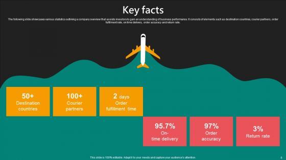 The following slide showcases various statistics outlining a company overview that assists investors to gain an understanding of business performance. It consists of elements such as destination countries, courier partners, order fulfilment rate, on time delivery, order accuracy and return rate. Find highly impressive Key Facts E Commerce Logistics Management Funding Pitch Deck Graphics Pdf on Slidegeeks to deliver a meaningful presentation. You can save an ample amount of time using these presentation templates. No need to worry to prepare everything from scratch because Slidegeeks experts have already done a huge research and work for you. You need to download Key Facts E Commerce Logistics Management Funding Pitch Deck Graphics Pdf for your upcoming presentation. All the presentation templates are 100 percent editable and you can change the color and personalize the content accordingly. Download now The following slide showcases various statistics outlining a company overview that assists investors to gain an understanding of business performance. It consists of elements such as destination countries, courier partners, order fulfilment rate, on time delivery, order accuracy and return rate.