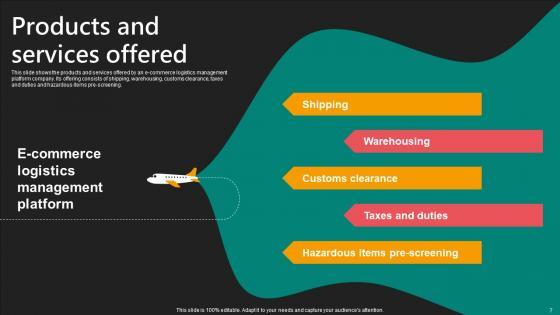 This slide shows the products and services offered by an e-commerce logistics management platform company. Its offering consists of shipping, warehousing, customs clearance, taxes and duties and hazardous items pre-screening. Formulating a presentation can take up a lot of effort and time, so the content and message should always be the primary focus. The visuals of the PowerPoint can enhance the presenters message, so our Products And Services Offered E Commerce Logistics Management Funding Pitch Deck Introduction Pdf was created to help save time. Instead of worrying about the design, the presenter can concentrate on the message while our designers work on creating the ideal templates for whatever situation is needed. Slidegeeks has experts for everything from amazing designs to valuable content, we have put everything into Products And Services Offered E Commerce Logistics Management Funding Pitch Deck Introduction Pdf This slide shows the products and services offered by an e-commerce logistics management platform company. Its offering consists of shipping, warehousing, customs clearance, taxes and duties and hazardous items pre-screening.