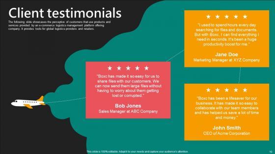 The following slide showcases the perceptive of customers that use products and services provided by an e-commerce logistics management platform offering company. It provides tools for global logistics providers and retailers. Create an editable Client Testimonials E Commerce Logistics Management Funding Pitch Deck Microsoft Pdf that communicates your idea and engages your audience. Whether you are presenting a business or an educational presentation, pre-designed presentation templates help save time. Client Testimonials E Commerce Logistics Management Funding Pitch Deck Microsoft Pdf is highly customizable and very easy to edit, covering many different styles from creative to business presentations. Slidegeeks has creative team members who have crafted amazing templates. So, go and get them without any delay. The following slide showcases the perceptive of customers that use products and services provided by an e-commerce logistics management platform offering company. It provides tools for global logistics providers and retailers.