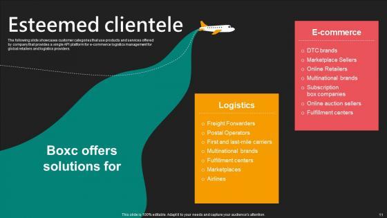 The following slide showcases customer categories that use products and services offered by company that provides a single API platform for e-commerce logistics management for global retailers and logistics providers. Do you have to make sure that everyone on your team knows about any specific topic I yes, then you should give Esteemed Clientele E Commerce Logistics Management Funding Pitch Deck Infographics Pdf a try. Our experts have put a lot of knowledge and effort into creating this impeccable Esteemed Clientele E Commerce Logistics Management Funding Pitch Deck Infographics Pdf. You can use this template for your upcoming presentations, as the slides are perfect to represent even the tiniest detail. You can download these templates from the Slidegeeks website and these are easy to edit. So grab these today The following slide showcases customer categories that use products and services offered by company that provides a single API platform for e-commerce logistics management for global retailers and logistics providers.