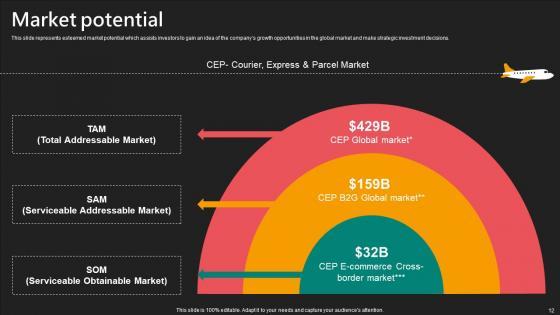 This slide represents esteemed market potential which assists investors to gain an idea of the companys growth opportunities in the global market and make strategic investment decisions. If you are looking for a format to display your unique thoughts, then the professionally designed Market Potential E Commerce Logistics Management Funding Pitch Deck Topics Pdf is the one for you. You can use it as a Google Slides template or a PowerPoint template. Incorporate impressive visuals, symbols, images, and other charts. Modify or reorganize the text boxes as you desire. Experiment with shade schemes and font pairings. Alter, share or cooperate with other people on your work. Download Market Potential E Commerce Logistics Management Funding Pitch Deck Topics Pdf and find out how to give a successful presentation. Present a perfect display to your team and make your presentation unforgettable. This slide represents esteemed market potential which assists investors to gain an idea of the companys growth opportunities in the global market and make strategic investment decisions.