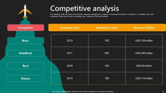 The following slide will assist an ecommerce logistics management company in showing the investors or audience a complete view of its competitive landscape based on founding year, employee count and revenue. Want to ace your presentation in front of a live audience Our Competitive Analysis E Commerce Logistics Management Funding Pitch Deck Demonstration Pdf can help you do that by engaging all the users towards you. Slidegeeks experts have put their efforts and expertise into creating these impeccable powerpoint presentations so that you can communicate your ideas clearly. Moreover, all the templates are customizable, and easy-to-edit and downloadable. Use these for both personal and commercial use. The following slide will assist an ecommerce logistics management company in showing the investors or audience a complete view of its competitive landscape based on founding year, employee count and revenue.