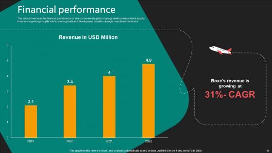 This slide showcases the financial performance of an e-commerce logistics management business which assists investors in gaining insights into business growth and development to make strategic investment decisions. From laying roadmaps to briefing everything in detail, our templates are perfect for you. You can set the stage with your presentation slides. All you have to do is download these easy-to-edit and customizable templates. Financial Performance E Commerce Logistics Management Funding Pitch Deck Clipart Pdf will help you deliver an outstanding performance that everyone would remember and praise you for. Do download this presentation today. This slide showcases the financial performance of an e-commerce logistics management business which assists investors in gaining insights into business growth and development to make strategic investment decisions.