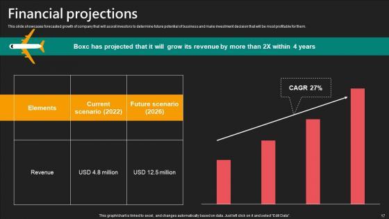 This slide showcases forecasted growth of company that will assist investors to determine future potential of business and make investment decision that will be most profitable for them. Present like a pro with Financial Projections E Commerce Logistics Management Funding Pitch Deck Portrait Pdf Create beautiful presentations together with your team, using our easy-to-use presentation slides. Share your ideas in real-time and make changes on the fly by downloading our templates. So whether you are in the office, on the go, or in a remote location, you can stay in sync with your team and present your ideas with confidence. With Slidegeeks presentation got a whole lot easier. Grab these presentations today. This slide showcases forecasted growth of company that will assist investors to determine future potential of business and make investment decision that will be most profitable for them.