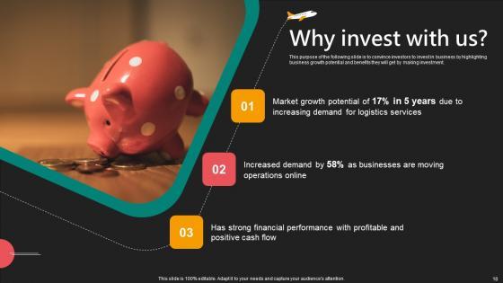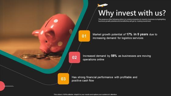 This purpose of the following slide is to convince investors to invest in business by highlighting business growth potential and benefits they will get by making investment. Explore a selection of the finest Why Invest With Us E Commerce Logistics Management Funding Pitch Deck Sample Pdf here. With a plethora of professionally designed and pre-made slide templates, you can quickly and easily find the right one for your upcoming presentation. You can use our Why Invest With Us E Commerce Logistics Management Funding Pitch Deck Sample Pdf to effectively convey your message to a wider audience. Slidegeeks has done a lot of research before preparing these presentation templates. The content can be personalized and the slides are highly editable. Grab templates today from Slidegeeks. This purpose of the following slide is to convince investors to invest in business by highlighting business growth potential and benefits they will get by making investment.