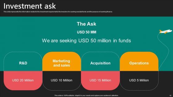 This slide represents the information related to the investment requirements the investors for seeking needed funds and the purpose of seeking finance. Whether you have daily or monthly meetings, a brilliant presentation is necessary. Investment Ask E Commerce Logistics Management Funding Pitch Deck Microsoft Pdf can be your best option for delivering a presentation. Represent everything in detail using Investment Ask E Commerce Logistics Management Funding Pitch Deck Microsoft Pdf and make yourself stand out in meetings. The template is versatile and follows a structure that will cater to your requirements. All the templates prepared by Slidegeeks are easy to download and edit. Our research experts have taken care of the corporate themes as well. So, give it a try and see the results. This slide represents the information related to the investment requirements the investors for seeking needed funds and the purpose of seeking finance.
