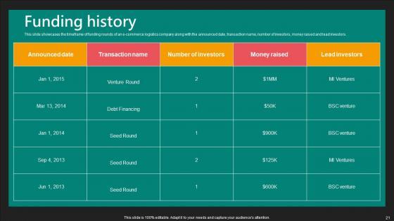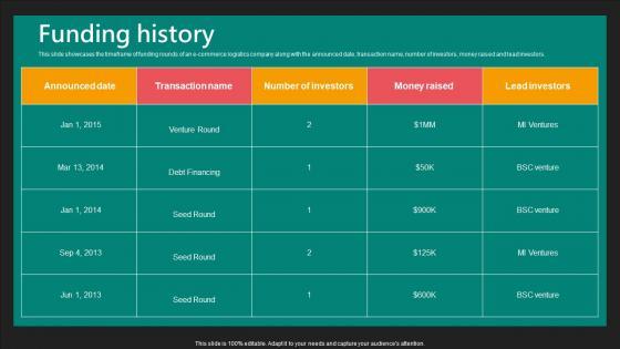 This slide showcases the timeframe of funding rounds of an e-commerce logistics company along with the announced date, transaction name, number of investors, money raised and lead investors. Slidegeeks is here to make your presentations a breeze with Funding History E Commerce Logistics Management Funding Pitch Deck Ideas Pdf With our easy-to-use and customizable templates, you can focus on delivering your ideas rather than worrying about formatting. With a variety of designs to choose from, you are sure to find one that suits your needs. And with animations and unique photos, illustrations, and fonts, you can make your presentation pop. So whether you are giving a sales pitch or presenting to the board, make sure to check out Slidegeeks first This slide showcases the timeframe of funding rounds of an e-commerce logistics company along with the announced date, transaction name, number of investors, money raised and lead investors.