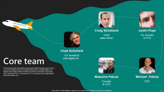 The following slide showcases key personnel of the executive team of an e-commerce logistics services company that provides a digital platform for retailers and supply carriers to deliver products to customers. It presents CEO, founder and COO, co-founder and CTO, co-founder and chief digital officer, chief sales officer, etc. There are so many reasons you need a Core Team E Commerce Logistics Management Funding Pitch Deck Infographics Pdf. The first reason is you can not spend time making everything from scratch, Thus, Slidegeeks has made presentation templates for you too. You can easily download these templates from our website easily. The following slide showcases key personnel of the executive team of an e-commerce logistics services company that provides a digital platform for retailers and supply carriers to deliver products to customers. It presents CEO, founder and COO, co-founder and CTO, co-founder and chief digital officer, chief sales officer, etc.