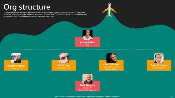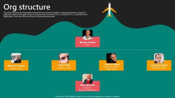 This slide showcases the organizational structure of an e-commerce logistics company that provides a single API platform to retailers and supply couriers. It consists of CEO, founder and COO, co-founder and CTO, co-founder and chief digital officer, chief sales officer and director of business development. Are you in need of a template that can accommodate all of your creative concepts This one is crafted professionally and can be altered to fit any style. Use it with Google Slides or PowerPoint. Include striking photographs, symbols, depictions, and other visuals. Fill, move around, or remove text boxes as desired. Test out color palettes and font mixtures. Edit and save your work, or work with colleagues. Download Org Structure E Commerce Logistics Management Funding Pitch Deck Slides Pdf and observe how to make your presentation outstanding. Give an impeccable presentation to your group and make your presentation unforgettable. This slide showcases the organizational structure of an e-commerce logistics company that provides a single API platform to retailers and supply couriers. It consists of CEO, founder and COO, co-founder and CTO, co-founder and chief digital officer, chief sales officer and director of business development.