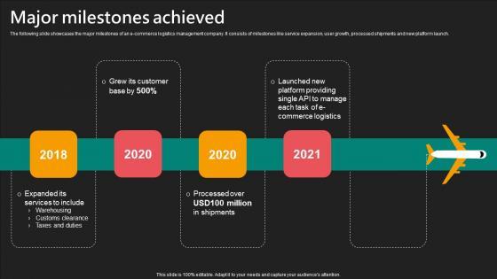 The following slide showcases the major milestones of an e-commerce logistics management company. It consists of milestones like service expansion, user growth, processed shipments and new platform launch. If your project calls for a presentation, then Slidegeeks is your go-to partner because we have professionally designed, easy-to-edit templates that are perfect for any presentation. After downloading, you can easily edit Major Milestones Achieved E Commerce Logistics Management Funding Pitch Deck Clipart Pdf and make the changes accordingly. You can rearrange slides or fill them with different images. Check out all the handy templates The following slide showcases the major milestones of an e-commerce logistics management company. It consists of milestones like service expansion, user growth, processed shipments and new platform launch.