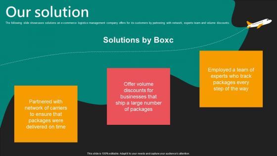 The following slide showcases solutions an e-commerce logistics management company offers for its customers by partnering with network, experts team and volume discounts. Crafting an eye-catching presentation has never been more straightforward. Let your presentation shine with this tasteful yet straightforward Our Solution E Commerce Logistics Management Funding Pitch Deck Graphics Pdf template. It offers a minimalistic and classy look that is great for making a statement. The colors have been employed intelligently to add a bit of playfulness while still remaining professional. Construct the ideal Our Solution E Commerce Logistics Management Funding Pitch Deck Graphics Pdf that effortlessly grabs the attention of your audience Begin now and be certain to wow your customers The following slide showcases solutions an e-commerce logistics management company offers for its customers by partnering with network, experts team and volume discounts.