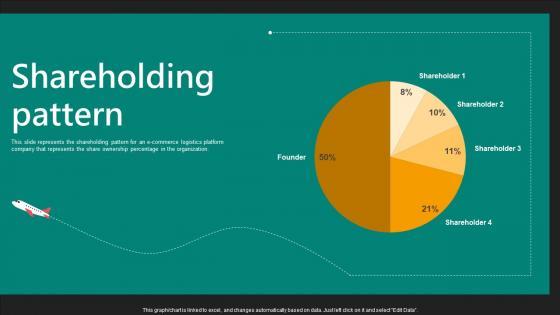 This slide represents the shareholding pattern for an e-commerce logistics platform company that represents the share ownership percentage in the organization. This modern and well-arranged Shareholding Pattern E Commerce Logistics Management Funding Pitch Deck Guidelines Pdf provides lots of creative possibilities. It is very simple to customize and edit with the Powerpoint Software. Just drag and drop your pictures into the shapes. All facets of this template can be edited with Powerpoint, no extra software is necessary. Add your own material, put your images in the places assigned for them, adjust the colors, and then you can show your slides to the world, with an animated slide included. This slide represents the shareholding pattern for an e-commerce logistics platform company that represents the share ownership percentage in the organization.