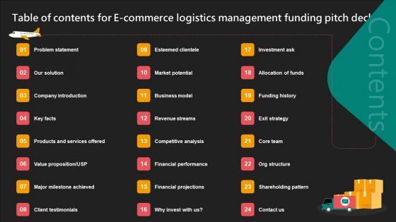This Table Of Contents For E Commerce Logistics Management Funding Pitch Deck Background Pdf is perfect for any presentation, be it in front of clients or colleagues. It is a versatile and stylish solution for organizing your meetings. The Table Of Contents For E Commerce Logistics Management Funding Pitch Deck Background Pdf features a modern design for your presentation meetings. The adjustable and customizable slides provide unlimited possibilities for acing up your presentation. Slidegeeks has done all the homework before launching the product for you. So, do not wait, grab the presentation templates today Our Table Of Contents For E Commerce Logistics Management Funding Pitch Deck Background Pdf are topically designed to provide an attractive backdrop to any subject. Use them to look like a presentation pro.