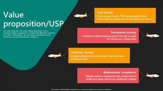 This slide showcases the unique selling propositions of an e-commerce logistics management company that differentiate products from others. Differentiators are cost-saving, transparent pricing, unlimited access and multinational compliance. Welcome to our selection of the Value Proposition Usp E Commerce Logistics Management Funding Pitch Deck Professional Pdf. These are designed to help you showcase your creativity and bring your sphere to life. Planning and Innovation are essential for any business that is just starting out. This collection contains the designs that you need for your everyday presentations. All of our PowerPoints are 100 percent editable, so you can customize them to suit your needs. This multi-purpose template can be used in various situations. Grab these presentation templates today This slide showcases the unique selling propositions of an e-commerce logistics management company that differentiate products from others. Differentiators are cost-saving, transparent pricing, unlimited access and multinational compliance.