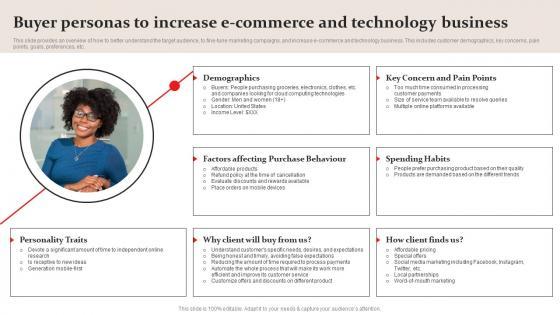 This slide provides an overview of how to better understand the target audience, to fine tune marketing campaigns, and increase e commerce and technology business. This includes customer demographics, key concerns, pain points, goals, preferences, etc. Slidegeeks is here to make your presentations a breeze with Buyer Personas To Increase E Commerce Amazon Business Plan Go To Market Strategy Icons Pdf With our easy to use and customizable templates, you can focus on delivering your ideas rather than worrying about formatting. With a variety of designs to choose from, you are sure to find one that suits your needs. And with animations and unique photos, illustrations, and fonts, you can make your presentation pop. So whether you are giving a sales pitch or presenting to the board, make sure to check out Slidegeeks first This slide provides an overview of how to better understand the target audience, to fine tune marketing campaigns, and increase e commerce and technology business. This includes customer demographics, key concerns, pain points, goals, preferences, etc.