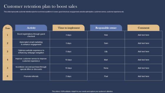 This slide represents customer retention plan for ecommerce platform. It covers guest checkout, engagement, website optimization, customer service, customer experience etc. Coming up with a presentation necessitates that the majority of the effort goes into the content and the message you intend to convey. The visuals of a PowerPoint presentation can only be effective if it supplements and supports the story that is being told. Keeping this in mind our experts created Customer Retention Plan Management And Marketing Strategies For E Commerce Icons Pdf to reduce the time that goes into designing the presentation. This way, you can concentrate on the message while our designers take care of providing you with the right template for the situation. This slide represents customer retention plan for ecommerce platform. It covers guest checkout, engagement, website optimization, customer service, customer experience etc.