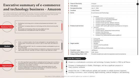 This slide provides the key highlights of the Amazon business including a quick pitch that describes the current market status of the industry and how the company will take leverage of the growth opportunities present in the market. It will also showcase details of its entity. Formulating a presentation can take up a lot of effort and time, so the content and message should always be the primary focus. The visuals of the PowerPoint can enhance the presenters message, so our Executive Summary Of E Commerce Amazon Business Plan Go To Market Strategy Brochure Pdf was created to help save time. Instead of worrying about the design, the presenter can concentrate on the message while our designers work on creating the ideal templates for whatever situation is needed. Slidegeeks has experts for everything from amazing designs to valuable content, we have put everything into Executive Summary Of E Commerce Amazon Business Plan Go To Market Strategy Brochure Pdf This slide provides the key highlights of the Amazon business including a quick pitch that describes the current market status of the industry and how the company will take leverage of the growth opportunities present in the market. It will also showcase details of its entity.