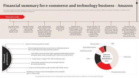 This slide provides the details related to Amazons financial performance based on its revenue growth and profitability. It includes information on the company operating in different industries, including e commerce, cloud computing, digital streaming, and artificial intelligence. This modern and well arranged Financial Summary For E Commerce Amazon Business Plan Go To Market Strategy Template Pdf provides lots of creative possibilities. It is very simple to customize and edit with the Powerpoint Software. Just drag and drop your pictures into the shapes. All facets of this template can be edited with Powerpoint, no extra software is necessary. Add your own material, put your images in the places assigned for them, adjust the colors, and then you can show your slides to the world, with an animated slide included. This slide provides the details related to Amazons financial performance based on its revenue growth and profitability. It includes information on the company operating in different industries, including e commerce, cloud computing, digital streaming, and artificial intelligence.