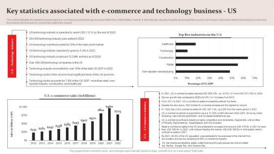 This slide highlights the detailed assessment of e commerce and technology business within the United States market. It will help get valuable insights and project the success of Amazons Business while introducing its brand and its products and services to consumers within the market. Are you searching for a Key Statistics Associated E Commerce Amazon Business Plan Go To Market Strategy Graphics Pdf that is uncluttered, straightforward, and original Its easy to edit, and you can change the colors to suit your personal or business branding. For a presentation that expresses how much effort you have put in, this template is ideal With all of its features, including tables, diagrams, statistics, and lists, its perfect for a business plan presentation. Make your ideas more appealing with these professional slides. Download Key Statistics Associated E Commerce Amazon Business Plan Go To Market Strategy Graphics Pdf from Slidegeeks today. This slide highlights the detailed assessment of e commerce and technology business within the United States market. It will help get valuable insights and project the success of Amazons Business while introducing its brand and its products and services to consumers within the market.