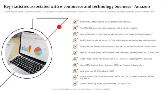 This slide highlights a detailed assessment of Amazons business in the global market. It will help understand its brand and its e commerce and technology based products and services offered to consumers within the market. Retrieve professionally designed Key Statistics Associated With E Commerce Amazon Business Plan Go To Market Strategy Themes Pdf to effectively convey your message and captivate your listeners. Save time by selecting pre made slideshows that are appropriate for various topics, from business to educational purposes. These themes come in many different styles, from creative to corporate, and all of them are easily adjustable and can be edited quickly. Access them as PowerPoint templates or as Google Slides themes. You do not have to go on a hunt for the perfect presentation because Slidegeeks got you covered from everywhere. This slide highlights a detailed assessment of Amazons business in the global market. It will help understand its brand and its e commerce and technology based products and services offered to consumers within the market.